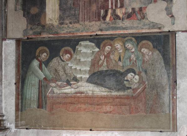 - NOTIZIE STORICO CRITICHE Il dipinto murale fa parte del ricco palinsesto di affreschi che coprivano la parete perimetrale destra delle chiesa di S. Francesco. Rispetto agli altri che, per vari motivi, vennero occultati e poi recuperati nel corso dei restauri degli anni trenta del Novecento, il Compianto rimase visibile nel corso dei secoli perché era oggetto di una fervente devozione ed è ricordato anche dalle guide ottocentesche. E' stato restaurato nel 1937 e poi nel 1967, quando viene riportato su tela. Stilisticamente il legame evidente con la cultura giottesca in generale e con gli affreschi padovani in particolare non è mai stato messo in discussione dalla critica, che tuttavia ha aperto una serie di ipotesi circa le modalità con cui questo linguaggio sia arrivato all'anonimo autore. Di fatto si sono create due correnti di pensiero divergenti. Da un lato viene sostenuto una derivazione diretta dalla Cappella degli Scrovegni, ipotesi che quindi presuppone una datazione alta per il dipinto che non andrebbe oltre gli anni dieci del Trecento; dall'altro i critici tendono a suggerire un legame con la cultura giottesca mediato dalla cultura veneta. Prova ne sarebbero un accresciuto patetismo dei volti dei personaggi, un forte espressionismo nelle posture e nella gestualità, una semplificazione dei piani compositivi. Quest'ipotesi critica propone una datazione agli anni trenta del XIV secolo. In ogni caso, il dipinto murale, insieme al Crocifisso conservato nella stessa chiesa, resta uno degli esempi più interessanti della diffusione del linguaggio giottesco in ambito lombardo.