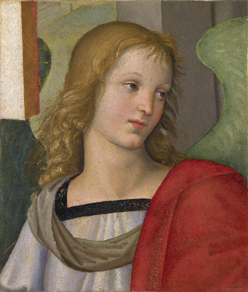 - NOTIZIE STORICO CRITICHE Il dipinto compare sul mercato antiquario fiorentino nel 1821, descritto come Ritratto di giovane eseguito da Raffaello Sanzio. Acquistato da Paolo Tosio con il certificato di autenticità dell'Accademia fiorentina, grazie all'interessamento di Teodoro Lechi, da allora affianca il Cristo benedicente, l'altra opera di Raffaello già nelle collezioni del conte Tosio. Ma perché il piccolo quadro viene identificato inizialmente come Ritratto di giovane? Sebbene sia facile riconoscere oggi la figura di un angelo, anche se frammentario, connotato dal bel volto leggermente reclinato, il profilo regolare e i boccoli descritti a punta di pennello, nonché dall'attacco delle ali, tutte le parti che denunciavano il suo stato di frammento erano state ricoperte con uno spesso strato di vernice scura per poter vendere il dipinto come opera "autonoma". Così manomessa l'opera è acquistata dal conte Tosio, per entrare verso la metà dell'Ottocento nelle collezioni civiche bresciane. Solo nel 1912 Oskar Fischel, profondo conoscitore di Raffaello, individua nel Ritratto il volto del primo angelo a sinistra della pala con L'incoronazione di S. Nicola da Tolentino dipinta per la chiesa di S. Agostino a Città di Castello. Sottoposto a restauro e alla contestuale rimozione della vernice nera dal fondo, la figura ha rivelato la presenza dell'ala e di altri elementi pertinenti alla composizione originaria.\nFortemente danneggiata in seguito al terremoto che nel 1789 distrugge la chiesa umbra, la pala era nota come "pala Baronci" dal nome di colui che nel Cinquecento la commissiona ad Evangelista da Pian di Meleto, maestro operoso in Urbino, e al diciassettenne Raffaello, per decorare una cappella all'interno della chiesa. Dopo il terremoto, le parti meno danneggiate, regolarizzate nella forma e ridotte nelle dimensioni, sono trasferite a Roma per volontà del papa Pio VI. Conservate per qualche tempo nell'appartamento papale in Vaticano, successivamente i frammenti risultano dispersi tra la chiesa di S. Luigi dei Francesi, il mercato antiquario e la collezione dei Borbone a Napoli.\nLa tavola bresciana rappresenta un tassello fondamentale per la ricostruzione dell'attività dell'Urbinate in quanto si tratta della sua prima opera documentata: seppur associato ad Evangelista da Pian di Meleto che firma il contratto, nei documenti relativi alla commissione Raffaello è definito "magister". Dopo il terremoto, un modesto pittore di nome Ermenegildo Costantini esegue una copia parziale della pala (relativa alla sola la parte inferiore) tuttora conservata nella Pinacoteca di Città di Castello, affinché nella chiesa rimanesse memoria dell'opera originale. Proprio il confronto con quest'ultima ha permesso a Fischel di identificare l'Angelo in esame e riconoscerne un altro, quando a Parigi nel 1986, a Silvie Béguin si presentò l'occasione di acquistare per il Louvre un "Ritratto di giovane" con caratteristiche simili al ritratto acquistato dal conte Tosio.