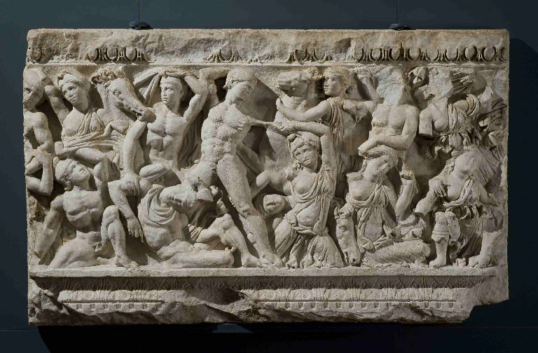 - NOTIZIE STORICO CRITICHE Nella lastra, in marmo bianco a grana media, è visibile parte del combattimento tra sette Amazzoni e sei guerrieri nudi, taluni con elmo. La lastra risulta tagliata alle estremità, forse in occasione del reimpiego. L'intrico dei corpi, enfatizzati dai chiaroscuri del rilievo, conferisce alla scena alta drammaticità, sottolineata anche dalle pieghe nervose dei panneggi che, in particolare nella parte destra della lastra, coprono completamente il piano di fondo. Le numerose e sovrapposte posture di Ammazzoni, guerrieri e cavalli, che marcano con la loro posizione le diverse profondità di campo, sembrano segnare, pur nella continuità del rilievo, una pausa del ritmo in corrispondenza della coppia centrale, in cui il guerriero nudo con il braccio sinistro trattiene per i capelli la donna inginocchiata che gli sta davanti, mentre con il destro sta per sferrare un colpo. Tale cesura sembra porre l'accento su queste due figure, che dovevano segnare l'asse mediano della lastra.\nLa lastra appartiene a una fronte di sarcofago prodotto tra il II ed il III secolo d. C. nella regione greca di Atene, l'Attica. A partire infatti dal regno dell'imperatore Adriano (118-138 d. C.), sino alla seconda metà del III secolo d. C., alcune botteghe di quella regione si specializzano nella realizzazione di sarcofagi, prevalentemente in marmo proconnesio, con scene di battaglie mitologiche scolpite in funzione dell'esaltazione del defunto, paragonato all'eroe del mito.\nIn questo caso la scena scolpita ha come protagonisti eroi ateniesi, raffigurati nudi, e le Amazzoni, guerriere a cavallo di origine orientale. L'intricato rilievo allude probabilmente all'episodio mitico della battaglia combattuta dalle Amazzoni alle pendici dell'acropoli di Atene per liberare la loro regina Antiope, rapita e sposata da Teseo con l'aiuto di altri guerrieri ateniesi.\nIl tema della morte e l'eroicità del combattimento fanno diretto riferimento alla destinazione della cassa e alla virtù del defunto.\nI sarcofagi attici venivano esportati in tutto il Mediterraneo; attraverso l'Adriatico arrivavano ad Aquileia e da qui distribuiti in Italia settentrionale. Per il tipo di marmo usato e per la complessità dei rilievi, erano destinati a personaggi di rango sociale elevato. Per quanto riguarda i pochi esemplari attici rinvenuti a Brescia, si può ipotizzare che essi siano appartenuti a membri di famiglie illustri.\nLa lastra con l'Amazzonomachia è stata recuperata nell'ottobre del 1998 dal pavimento, steso in età bassomedievale, nella chiesa di S. Salvatore, reimpiegata con la parte a rilievo rivolta verso il basso, insieme ad altri frammenti di sarcofago di età romana.