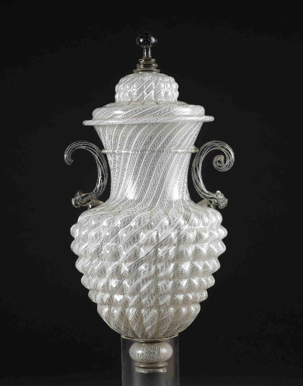 Il vaso presenta un coperchio in filigrana realizzata dall'intreccio di canne di lattimo (vetro bianco opalescente) ad andamento diagonale e di canne in sottili fili di cristallo e di lattimo ritorti (retortoli). Il corpo, soffiato a stampo, è decorato con un motivo a bugne nella fascia centrale, mentre in quella superiore e in quella inferiore presenta delle baccellature. Il raccordo del vaso al piede, perduto, è costituito da un nodo in filigrana. Il collo cilindrico presenta una leggera svasatura verso la bocca, sottolineata da un filo vitreo incolore ed è corredato da due anse applicate in cristallo, con un filo di lattimo incluso, terminanti nella parte inferiore con due more in cristallo, ottenute a stampo. Il coperchio, sempre in filigrana a retortoli, riprende il medesimo motivo decorativo a bugne e baccellature del corpo, e termina con una presa in cristallo.