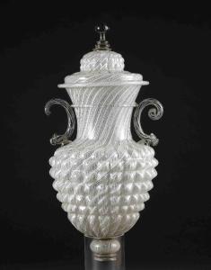- NOTIZIE STORICO CRITICHE Il vaso poteva contenere liquidi, forse vino: la presenza del coperchio era necessaria affinché non evaporassero. Vasi di questa forma, ma privi di decorazioni a rilievo, e con questa destinazione d'uso, si trovano raffigurati in un dipinto di Hamen y Leon, pittore di origine fiamminga ma attivo in Spagna, che nei primi due decenni del Seicento raffigura spesso nelle sue nature morte vetri veneziani, façon de Venise, catalani e medicei.\nNel terzo decennio del Cinquecento, i vetri soffiati in filigrana a retortoli soppiantano nel gusto dei committenti più aggiornati i vetri smaltati: in questa produzione si specializzano per primi i fratelli FIlippo e Bernardo Serena, che nel 1527 ottengono un privilegio decennale per questo genere di lavorazione. Gli oggetti dei Serena risultano particolarmente apprezzati da Isabella d'Este Gonzaga, che tramite il suo ambasciatore a Venezia cerca di assicurarsi i nuovi prodotti vetrari esposti in occasione della festa dell'Ascensione del 1529. Nell'anno seguente la marchesa di Mantova visita la vetreria dei Serena, dove rimane colpita dallo splendore dei soffiati, simili a quelli preparati per la credenza del sultano turco Solimano il Magnifico. Isabella decide di acquistarli, così come il fratello Alfonso d'Este che l'ha di poco preceduta nella vetreria dei Serena. I soffiati veneziani riscuotono quindi un particolare successo non solo presso le corti italiane ed europee, ma anche in Oriente, dove sono importati e spesso offerti come doni diplomatici per tutto il Cinquecento.
