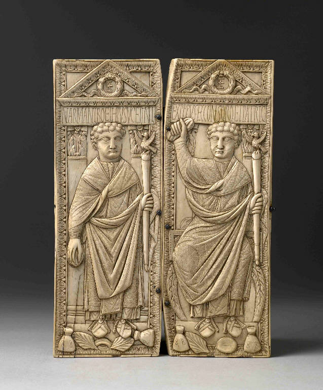 - NOTIZIE STORICO CRITICHE Realizzato come dittico consolare, celebrativo dell'assunzione alla carica di console, nel 487 d.C, da parte di Nario Manlio Boezio, padre del filosofo Boezio, il prezioso manufatto ha subito nel tempo una radicale trasformazione, passando dalla destinazione profana a quello ecclesiastica.\nMentre le due valve anteriori presentano raffigurazioni di pura rappresentanza, dove il console appare distaccato dal mondo (come un sovrano o un santo), fisso e immobile nella sua gestualità sobria e contenuta, al verso sono riprodotte due eleganti miniature di soggetto cristiano e si legge l'iscrizione "QVOS DEO OFFERIMVS" seguita dalle liste che testimoniano come in epoca posteriore, precisamente nel VII secolo, il dittico sia stato riutilizzato in ambito ecclesiastico come memoriale di benefattori defunti o viventi della Chiesa.\nIl dittico di Boezio racconta una lunga storia, che alcuni studiosi hanno collegato fin dai tempi remoti all'ambiente bresciano. In particolare, l'individuazione nelle liste memoriali dei nomi di Anatalone e Filastrio, antichi vescovi di Brescia, ha consentito di avanzare l'ipotesi che la Chiesa bresciana avesse utilizzato per secoli il dittico nella liturgia. In realtà i nomi non sono oggi più leggibili, essendo stati abrasi e riscritti prima che il tempo ne cancellasse l'inchiostro, e dunque l'ipotesi rimane solo suggestiva e non verificabile.\nIl dittico evidenzia una scarsa tecnica artigianale, soprattutto nella raffigurazione del console che appare goffo e statico; l'autore si compiace di descrivere gli elaborati ricami della veste, ma non è in grado di conferire vivacità alla maschera facciale che risulta larga, schiacciata e inespressiva. Gli elementi di contorno (sacchetti, foglie, una patera) sono eseguiti con incertezza; anche l'iscrizione sull'architrave è inelegante e lontana dalla classica solennità. Di livello artistico più elevato sono invece le due miniature nella parte cristiana del dittico che raffigurano rispettivamente la Resurrezione di Lazzaro, sulla valva sinistra, confrontabile per scelte stilistiche con la miniatura omologa nel Codice Purpureo di Rossano Calabro, del VI secolo, e i tre Dottori della Chiesa d'Occidente, Girolamo, Agostino e Gregorio, nella parte superiore della valva di destra, che per la posizione rigidamente frontale, la fissità dello sguardo e la rigida gestualità rimandano stilisticamente al gusto bizantino.\nDi proprietà della famiglia bresciana Barbisoni, che l'aveva ereditato verso la metà del XVII secolo dal cavaliere Lodovico Baitelli, il dittico di Boezio è pubblicato per la prima volta nel 1717 e successivamente fatto oggetto di una vasta campagna di studi patrocinata dal cardinale Angelo Maria Querini. Dopo essere passato, per via ereditaria, in mani diverse, il dittico è donato dai nobili Fè al Comune di Brescia; depositato presso la Biblioteca Queriniana fino al 1882 è successivamente trasferito nel Museo Civico dell'Età Cristiana.