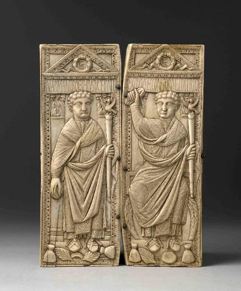 Le due valve anteriori, in avorio, raffigurano il console romano Boezio: a sinistra ritratto in piedi e immobile, a destra assiso su una cattedra mentre presiede ai giochi del circo. In entrambe le figure, la figura tiene nella mano sinistra lo scettro coronato dall'aquila ad ali spiegate, mentre nella destra stringe la mappa, ossia il drappo di lino con il quale, secondo un'usanza che si vuole introdotta da Nerone, si dava il segnale di partenza alle corse di quadrighe.\nNella raffigurazione della valva di destra il console è ritratto nell'istante di dare il via alla gara, mentre in realtà non interagisce con alcuna scena narrativa, che si può quindi solo immaginare. \nLe valve mostrano sul verso due eleganti miniature con soggetti cristiani (La resurrezione di Lazzaro e Tre dottori della Chiesa), corredati da un'iscrizione votiva.