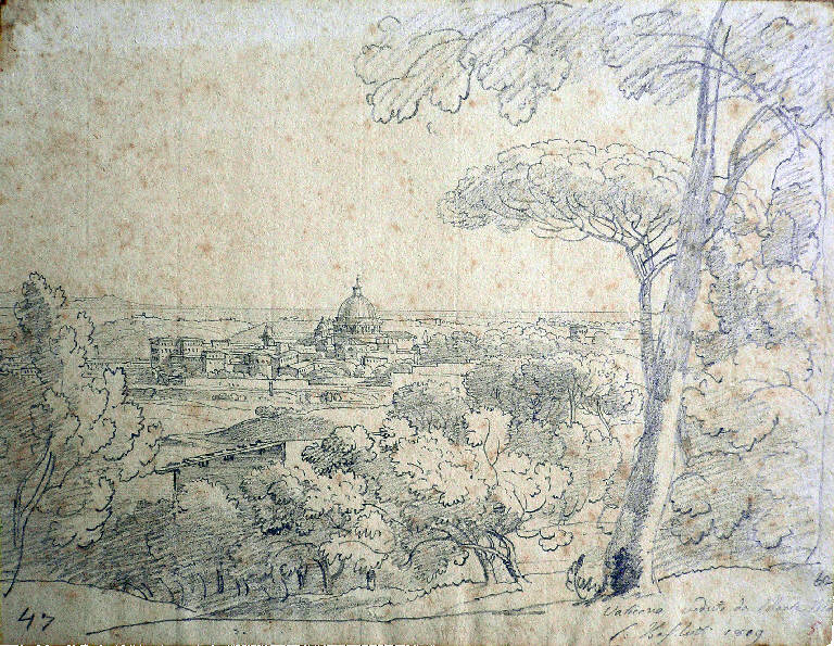 Un albero frondoso sulla destra, interrotto dal limite del foglio, funge da quinta a una radura boscosa, in fondo alla quale si apre uno scorcio della Città Eterna. Al centro, elemento di unione tra cielo e terra, spicca la cupola della basilica di S. Pietro circondata da costruzioni più basse. In basso a destra si legge l¿iscrizione "Vaticano veduto da Monte Ma[rio]/ L. Basiletti 1809".