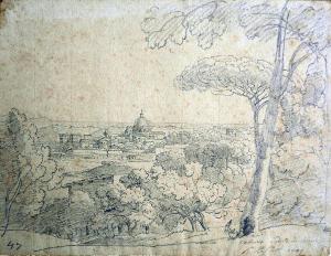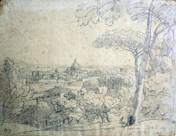 - NOTIZIE STORICO CRITICHE Questa scenografica veduta di taglio panoramico ha la prerogativa di essere uno studio dal vero che conduce al confronto con un¿altra veduta riferita all¿esperienza del soggiorno di Basiletti a Roma, ossia "Porta Romana del popolo" (Brescia, Musei Civici d¿Arte e Storia). Entrambe sono caratterizzate da notevole immediatezza, quasi fotografica, ma ancora legate a schemi compositivi di matrice secentesca, in cui il rilevamento grafico assume un ruolo fondamentale. Con pochi ma precisi tratti di matita, velocemente tracciati su fogli di ridotte dimensioni, il pittore restituisce panorami in cui gli edifici sono limitati a presenze smaterializzate. Lo studio dal vero nella pittura di paesaggio tra Sei e Settecento si qualifica come esercizio per addestrare l¿occhio e la mano, finalità che l¿artista risolve nel tracciare velocemente il disegno. Nella storia di pittura di paesaggio, Roma trova il suo fulcro di attrazione internazionale: dalla metà del Settecento fino alla prima metà del secolo successivo la città dei Papi diviene infatti l¿inevitabile destinazione di ogni paesaggista europeo. Quando Basiletti giunge a Roma nel 1803, la cerchia delle sue amicizie comprende tra gli altri due artisti olandesi che avevano raggiunto una certa notorietà: Wilhelm Friedrich Gmelin (1760-1820), celebre incisore specializzato in paesaggi di grande formato, e Hendrik Voogd (1777-1830) suo "amico affezionatissimo". Le doti di disegnatore di quest¿ultimo costituiscono certamente per Basiletti una lezione fondamentale. Il pittore bresciano scopre infatti, grazie a loro, la propria vocazione di paesaggista. I tratti distintivi che emergono dai suoi studi sono il tratteggio delle parti in ombra, la resa della cosiddetta "frappa", ossia il fogliame degli alberi, la ramificazione delle essenze arboree e l¿attenzione per i dettagli descrittivi. L¿originaria consistenza dei disegni di Basiletti si deduce dalla parte del fondo conservata dagli eredi, rintracciabile presso diverse collezioni private anche in nuclei omogenei. \nIl foglio appartiene alla ricca collezione nella quale Malossi raccolse oltre 1500 tra disegni e cartoni preparatori per tele e affreschi eseguiti da noti artisti bresciani operosi prevalentemente nella seconda metà dell¿Ottocento. Oltre a quello in esame la collezione annovera un altro foglio di tema romano dedicato alla Villa di Tivoli, firmato e datato da Basiletti al 1819.