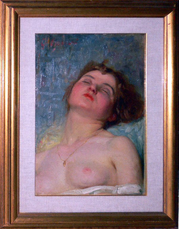 La tela è occupata per tre quarti dal ritratto di una giovane donna a seno scoperto, addormentata con la testa reclinata all¿indietro. La nudità è interrotta solo da un piccolo lembo di stoffa bianca calato sotto il seno e da una sottile catenella d¿oro che segue la morbidezza del corpo femminile. La pelle diafana funge da "anticamera" al volto con le gote accese e le labbra vive, mentre la linea sinuosa che dalle spalle risale lungo il collo fino alla morbida massa di capelli, traccia il confine tra la figura e il fondo azzurro, steso con larghe pennellate screziate. Il dipinto è firmato in alto a sinistra "G. Cresseri".