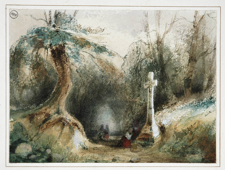 - NOTIZIE STORICO CRITICHE Il tipo non accademico di paesaggio e l'uso libero, "tuneriano" delle tecniche dell'acquerello e della tempera (usata solo in parti marginali) ci dicono che il disegno è stato eseguito negli anni della Scuola di Posillipo (1925-1935), molto probabilmente dal vero.\nAllegato al foglio si trova una bolla di acquisto della Galleria d'arte Geri di corso Venezia a Milano, con la data "11.1968", le indicazioni "Lotto n. 16 - £ 26.000", la scritta "Pitloo" e la firma "Lampugnani". \nNell'album "D 6 1800-1900" è conservata la foto del disegno con la data stampata "mar. 70".
