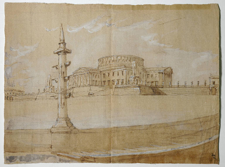 - NOTIZIE STORICO CRITICHE La datazione è ipotizzata tenendo conto della scritta "Juvarra", molto probabilmente di mano di Riccardo Lampugnani, sul supporto di cartone, e del confronto del soggetto rappresentato con alcuni disegni dell'architetto messinese. Rimanda a Juvarra l'edificio a pianta centrale come sede di una villa di ispirazione palladiana, inserita in un cortile ampio, spazioso, comunicante in certi casi , tramite un camminamento che corre lungo il perimetro del cortile e terminanate in gradini, con corsi d'acqua a un livello inferiore: idea questa cara all'architetto fin dagli anni giovanili, quando per esempio nel 1714 progetta un "palazzo in villa" per la famiglia Guinigi a Viareggio o quando, ancora prima, nell'ambito dei progetti per il concorso Clementino di Roma del 1707, progetta una villa presso la riva di un fiume (Millon 1984; Gritella 1992). Il tipo di pilastro in primo piano è identico a quello presente in un disegno di "Fantasia architettonica", non datato, con dedica al re di Polonia (Gritella 1992). Il pronao aggettante - anche se in parte murato - dell'edificio richiama quello della basilica di Superga (1715-1718). Ma il richiamo a Juvarra è soprattutto nella resa di una spazialità di ampio respiro, nella quale l'architettura è inserita armoniosamente e in rapporto di comunicazione. Il disegno rientra tra i progetti numerosi rimasti tali, non realizzati ma non per questo assimilabili alla veduta fantastica o alla scenografia. Quest'ultima affermazione viene fatta senza l'intenzione di sminuire l'opera di Juvarra scenografo, ma in accordo con quanto affermato da Ferrero Viale nel 1970 contrapponendosi alla distinzione netta fatta da Cesare Brandi tra i disegni di scenografia giovanili e quelli di architettura, distinzione poi "dialettizzata", attenuata da Argan ( Argan 1970).\nUna foto in bn è conservata nell'album "B SCEN-ARC" di Riccardo Lampugnani; altre due foto, a colori, si trovano nell'album "D11 SCEN-ARC": la collocazione di una di queste fra due disegni di Galliari può essere interpretata come una indicazione del gusto che, ancora negli anni sessanta, tendeva a considerare Juvarra come architetto e scenografo "barocco" più che come architetto moderno per i suoi tempi e quindi "pre-illuminista".