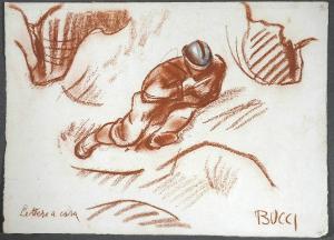 - NOTIZIE STORICO CRITICHE Il disegno appartiene alla serie eseguita da Bucci durante le sue missioni ai fronti nel Veneto e in Friuli, dove combattè prima con il 68° Reggimento Fanteria, poi nel Battaglione San Marco, durante la grande guerra. Molti di questi disegni servivano come prova per incisioni a puntasecca eseguite successivamente per i 4 album - complessivamente di 50 incisioni - "Croquis du Front Italien" edito nel 1917, o per litografie raccolte poi nei due album, stampati da Alfieri e Lacroix nel 1918, "Finis Austriae" (12 lito a colori, in 200 esemplari) e "Marina a terra" (50 lito a colori, in 250 esemplari); altri disegni eseguiti al fronte furono da Bucci inviati a giornali e riviste.\nTra i numrosi disegni custoditi preso il Museo Centrale del Risorgimento di Roma si trova "In trincea" (MCRR, Cassetta XLII -38) (A. Merigliano 2002, p. 135), avvicinabile per dimensioni, tecnica e stile a quello qui schedato.\nTre foto a colori (una del foglio intero, due con i particolari della scritta e della firma) sono conservate nell'album "D 1000-1900".