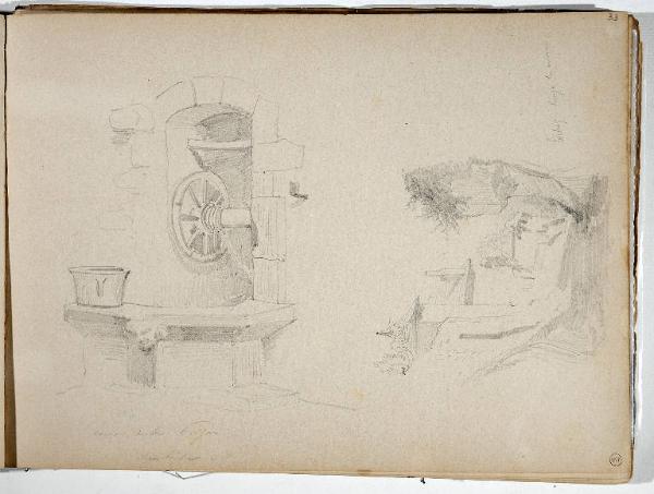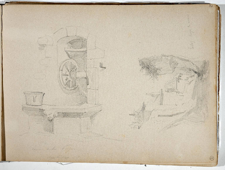 carta bianca ingiallita; matita chiara e matita scura; il foglio è stato diviso da Bossoli in due metà con una riga a matita e reca due disegni distinti: si esamina in questa scheda il disegno sulla metà sinistra.