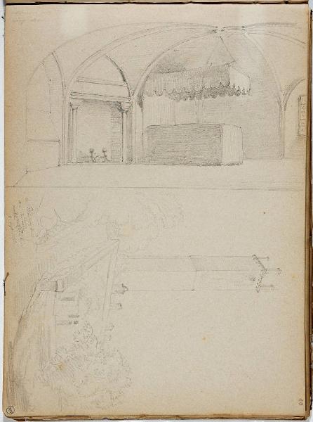 carta bianca ingiallita; matita chiara e matita scura; il foglio è stato diviso da Bossoli in due metà con una riga a matita e reca due disegni distinti: si esamina in questa scheda il disegno sulla metà sinistra del foglio, che si legge ruotando il taccuino di 90 gradi in senso orario.