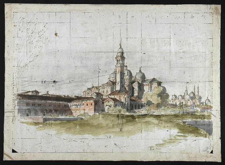 carta bianca quadrettata a penna e inchiostro bruno; acquerello colorato