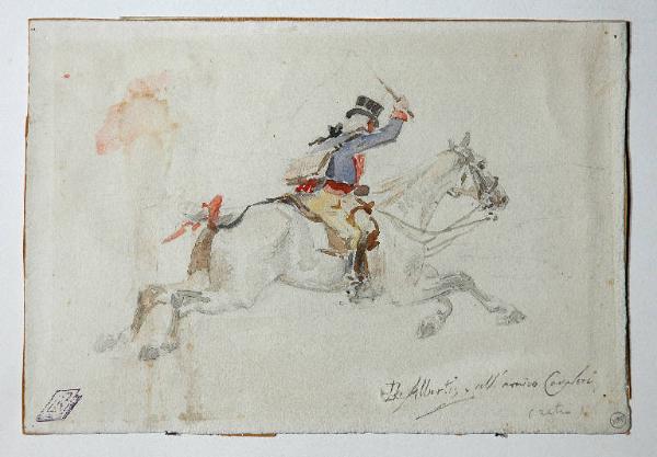 - NOTIZIE STORICO CRITICHE La caratterizzazione del personaggio, con un cappello signorile, il codino, una cartella a tracolla e un piccolo drappo sulla coda del cavallo, fanno pensare a un ritratto, ambientato in un paesaggio appena schizzato a matita sullo sfondo.\nUna foto del disegno è conservata nell'album "D 6 1800-1900".
