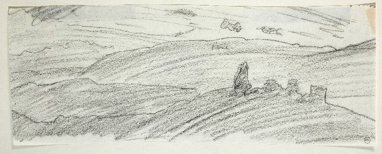 - NOTIZIE STORICO CRITICHE Il disegno fa parte di un insieme, con numeri di inventario da 5008 a 5026, conservati da Riccardo Lampugnani in una cartelletta di cartone con etichetta che reca l'iscrizione a penna "Luigi Bertelli 20 disegni originali" e, sempre a penna: "1852-1916, e altri". I disegni pevenuti al museo Poldi Pezzoli sono 19. Il disegno mancante è documentato da una foto nell'Album "D 15" e rappresenta una piccola figura femminile davanti a un albero. Nello stesso Album è conservata una foto in b/n del presente disegno. La datazione post quem proposta indica il periodo tardo dell'attività di Bertelli, caratterizzato dallo studio dal vero (prediletto dall'artista) del paesaggio reso con un tratto sintetico in una impaginazione di ampio respiro che spesso presenta un punto di vista lontano e rialzato.