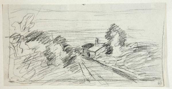 - NOTIZIE STORICO CRITICHE Il disegno fa parte di un insieme, con numeri di inventario da 5008 a 5026, conservati da Riccardo Lampugnani in una cartelletta di cartone con etichetta che reca l'iscrizione a penna "Luigi Bertelli 20 disegni originali" e, sempre a penna: "1852-1916, e altri". I disegni pevenuti al museo Poldi Pezzoli sono 19. Il disegno mancante è documentato da una foto nell'Album "D 15" e rappresenta una piccola figura femminile davanti a un albero. Nello stesso Album è conservata una foto in b/n del presente disegno (recto). La datazione post quem proposta indica il periodo tardo dell'attività di Bertelli, caratterizzato dallo studio dal vero (prediletto dall'artista) del paesaggio reso con un tratto sintetico in una impaginazione di ampio respiro che spesso presenta un punto di vista lontano e rialzato. Lo stesso paesaggio di questo disegno è riportato, da punti di vista diversi, nei disegni con numeri d'inventario 5017, 5024, 5025.