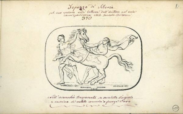 - NOTIZIE STORICO CRITICHE L'album è composto da 51 fogli rilegati, recanti il disegno e la descrizione di una parte della collezione di gemme e sigilli antichi e moderni appartenuta al conte Paolo Vimercati Sozzi (Milano 1801- Bergamo 1883). Curatore e studioso della sua ricchissima collezione di antichità, in parte donata alla città di Bergamo per sua volontà testamentaria, Sozzi aveva redatto in prima persona gli album, o cataloghi, degli oggetti da lui raccolti, oggetti che egli stesso raffigurava, negli anni in cui non poteva servirsi della fotografia (prima degli anni settanta), con disegni al tratto che cercavano di riprodurre fedelmente i manufatti, dei quali egli indicava anche la collocazione fisica nelle tavolette conservate molto probabilmente nei mobili bassi a vetrina della sua casa-museo di Bergamo (Caldarini-Mazzucchelli 2004, fig. 8). Molti di questi oggetti sono andati dispersi. In particolare, le gemme e gli album redatti per catalogarne la collezione, come l'"Album della Dattiloteca" e gli "Album glittografici n. 1, 2, 3" sono andati dispersi dagli eredi nell'asta indetta a Milano nel maggio 1893 (ibid., p. 191). Il piccolo album della collezione Lampugnani corrisponde alla breve descrizione inventariale data dalla studiosa del terzo dei tre album glittografici da lei non rintracciati della raccolta o "museo" Sozzi ma citati appunto con una succinta descrizione inventariale in altri documenti scritti dallo stesso Sozzi che invece ci sono pervenuti e sono conservati, come ci dice la studiosa, presso la Biblioteca civica Angelo Mai di Bergamo.\nLe gemme dell'album glittografico n. 3 sono copiate a matita, ripassate a penna e brevemente descritte con l'indicazione dettagliata del materiale, cioè del tipo di pietra, del tipo di lavorazione (a rilievo o no) e della collocazione fisica dell'oggetto (le gemme erano conservate da Sozzi su delle tavolette o, nel caso degli intagli più preziosi, come quello di Giovanni Beltrami catalogato alla p. 1, «su cavalletto d'argento», «nell' armadio trasparente»). L' intento di Sozzi è di tipo documentario, scrupoloso ma più attento al dato scientifico o naturalistico (il tipo di pietra è sempre citato) e catalografico (sono sempre citati, accanto a ogni gemma, i numeri della tavoletta e della collocazione dell'oggetto all'interno di questa) piuttosto che formale e stilistico: è difficile distinguere se la gemma disegnata nell'album fosse antica o moderna; un po' più facile è riconoscere se si tratta di una gemma degli utimi decenni del settecento e della prima metà dell'ottocento. Alcuni (pochi) disegni di gemme riportano la firma dell'autore dell'intaglio o del rilievo (Beltrami, Pichler, Marchant, Berini, Bertioli, Mastini) e questo ha permesso l'identificazione della gemma, che in alcuni casi non risulta essere nota, per soggetto e materiale (v. la gemma firmata Berini a p. 11), negli studi specialistici di questo settore. La presenza di una gemma di Giovanni Beltrami doveva essere un elemento qualificante la raccolta Sozzi, e lo spazio maggiore dato alla sua raffigurazione nell'album, oltre che la sua particolare collocazione fisica, dimostrano la consapevolezza di Sozzi della qualità artistica alta dell'oggetto. Le pp. 12-16 e 41 recano il disegno di alcune pietre incise con la raffigurazione di stemmi gentilizi. E' possibile riconoscere due stesure, eseguite da Sozzi con un certo intervallo di tempo, dei disegni dell'album: la prima (pp. 1-11, 27-40, il disegno centrale a p. 41, pp. 42-45, p. 51) mostra una resa più sicura dei soggetti, un tratto più netto, un disegno più pulito; la seconda, riconoscibile da un inchiostro più scuro, comprende i disegni degli stemmi, delle "gemme literate" e delle pietre meno preziose o raffiguranti soggetti non accademici, copiati da Sozzi in un secondo momento (pp. 12-26, i disegni degli stemmi piccoli a p. 41, pp. 46-50). \nLa datazione estensiva proposta per la stesura dei disegni dell'album tocca il periodo dal 1830 circa, quando il giovane Sozzi intraprende i suoi primi viaggi nei Regni italiani, nel corso dei quali inizia a interessarsi alle antichità emerse negli scavi, a visitare le raccolte romane e ad acquistare reperti archeologici - nonostante l'entrata in vigore delle prime leggi di tutela del patrimonio - , e il 1883, anno della sua morte. La data ante quem è proposta per estensione ed è motivata dall'iscrizione presente sul verso della pagina non numerata inserita tra le pp. 47 e 48 che, nella calligrafia di Sozzi anziano, descrive alcune gemme indicando la data di acquisto di una di queste, 22 agosto 1880.\nRingrazio la dott.ssa Gabriella Tassinari per il prezioso aiuto dato nell'identificazione dei soggetti e degli autori degli intagli e dei cammei.
