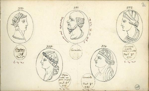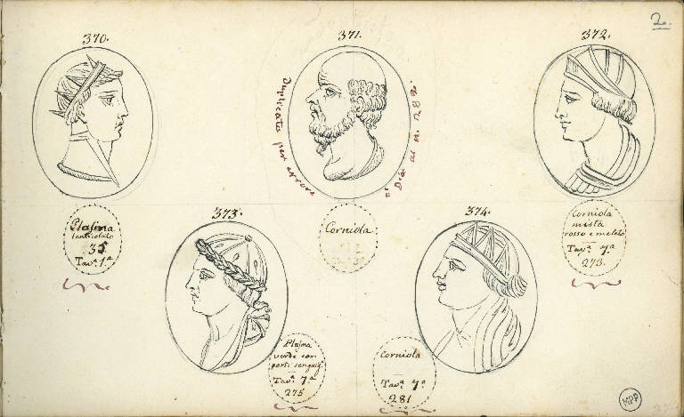 - NOTIZIE STORICO CRITICHE I disegni si riferiscono a gemme riferibili al cinquecento o al seicento, per il loro materiale (la corniola è diffusissima nella produzione di gemme intagliate nei due secoli) e per quanto si può dedurre, dal disegno, dello stile delle teste intagliate.