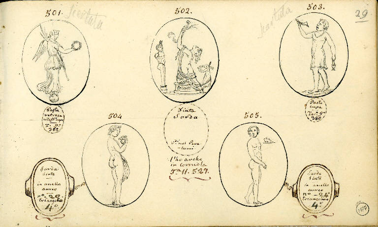 - NOTIZIE STORICO CRITICHE Il disegno con n. 502 raffigura, con piccole varianti, un'iconografia molto diffusa nelle collezioni di gemme di fine settecento-inizi ottocento, iconografia da molti allora ritenuta antica e dal significato non chiaro; se ne trovava una anche nella collezione di Goethe; Sozzi ci informa nell'iscrizione di possedere un altro esemplare, in corniola. L'iconografia è stata oggetto di uno studio recente (Morricone Matini 1992) che ha preso le mosse da un rilievo marmoreo databile alla prima metà del cinquecento, conservato fin dal 1637 nella collezione sabauda di Torino, portato poi a Parigi nel corso delle spoliazioni napoleoniche e tutt'ora conservato al Louvre (ibid., fig. 61). Questo studio permette di vedere nella gemma raffigurata in questo disegno una replica di una gemma in pasta di topazio, che oggi risulta dispersa, che a sua volta è una variante della più famosa gemma, non antica, donata poco dopo il 1602 a Francesco IV re di Francia da Monsignor Rascas de Bagarris e ora conservata al Cabinet des Medailles della Bibliothèque Nationale di Parigi (ibid., figg. 34-35). La pasta di topazio venne eseguita da un intagliatore che faceva parte della cerchia di Cassiano dal Pozzo, al quale questa apparteneva, ed è nota a noi dall'incisione di P.A.Maffei nel volume "Gemme antiche figurate.." del 1708 (ibid, fig. 42); è plausibile, secondo la Morricone M., che anche la gemma di Parigi sia stata eseguita nella cerchia di Cassiano dal Pozzo, la cui famiglia era originaria di Torino. Vi sono raffigurate tre figure: una Menade vista di spalle mentre solleva un idolo, un'erma a torso di Pan, un satiro (che nel disegno Sozzi appare come una figura femminile) intento a bere da un corno (nel disegno Sozzi trasformato in un altro oggetto); l'insieme è il risultato dell'assemblaggio di questi singoli elementi, il principale dei quali noto in età antica (la Menade nello stesso atteggiamento appare in un cammeo proveniente da Pompei conservato al Museo Archeologico di Napoli, ibid., fig. 21; la collezione di gemme del cardinale Pietro Barbo, in parte confluita nel tesoro di Lorenzo il Magnifico, comprendeva due gemme con la stessa figura femminile, vedi ibid., pp. 20-21), da parte di un incisore moderno. La Morricone M. ha spiegato come questo assemblaggio sia stato ispirato, nel periodo compreso tra il 1530 circa e il 1602, oltre che dalla possibile conoscenza delle gemme della collezione Barbo e delle copie moderne da queste tratte, da due fonti figurative: l'iconografia del rilievo già a Torino e ora al Louvre, costituita dalla Menade ebbra reggente l'idolo affiancata da un busto-ritratto posto su una colonna; le figure di satiri e baccanti che suonano e delle erme di Pan, liberamente tratte dai disegni cinquecenteschi (molti dei quali eseguiti da Cassiano dal Pozzo) dei sarcofagi dionisiaci romani. \nNon si può dire con certezza se la pasta vitrea ("finta sarda") e la corniola della collezione Sozzi presentassero realmente le varianti che appaiono nel disegno - oltre a quelle relative al satiro e al contenitore da cui questi beve, sopra indicate, il tipo dell'idolo che non sembra reggere un doppio flauto, come nell'incisione di Maffei, ma due brevi lacci svolazzanti, e il tirso che appare trasformato in una lancia, mentre i due svolazzi del tirso sono trasformati nelle ciocche di capelli al vento della figura femminile nella quale è stata "tradotta" la figura del satiro - o se queste varianti siano il risultato di una lettura non corretta di Sozzi o di colui che ha eseguito il disegno.\nIl disegno con n. 505 presenta lo stesso problema, perchè riporta l'iconografia dell'Ermes crioforo con la variante dell'oggetto recato dal dio, non una testa d' ariete, come risulta in un calco di Giovanni Pichler, con lo stesso soggetto, conservato al Medagliere del Castello Sforzesco a Milano (Tassinari 2000, fig. 1 in basso, primo a sinistra), ma un oggetto non bene identificabile (due colombe?).\nAccanto ai disegni con i nn. 504 e 505 sono disegnate due montature di anello, al cui interno sono le iscrizioni relative alle due gemme copiate.