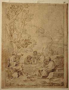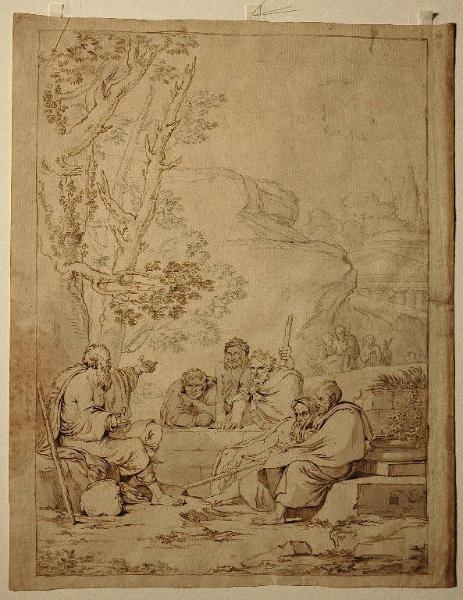 - NOTIZIE STORICO CRITICHE Il disegno sul recto riprende un altro disegno, non finito, dello stesso autore, conservato presso la Galleria d'Arte Moderna di Roma (collez. Milano n. 46; c/ 6207/ 158), sul quale Minardi ha scritto a matita, in basso: "Imitazione di Salvator Rosa/ Alcune persone che consultano Diogene filosofo / 64", riferendosi probabilmente al disegno di Salvator Rosa "Disputa di filosofi" ora conservato (probabilmente fin dalla metà del XVIII secolo) presso l'Accademia Nazionale di San Luca a Roma (Disegni di 1982, v.II, pp. 88 e 15; Accademia Nazionale 1974, p. 332, fig. 6). Il disegno Lampugnani appartiene al gruppo di circa cinquecento disegni di Minardi già appartenuti agli eredi Milani e andati dispersi tra il 1920 e il 1950 circa (Durbè 1982, v. I, pp. XI-XII).\nSono conservate tre foto con i particolari delle figure in primo piano nell'Album "D4" di Riccardo Lampugnani.