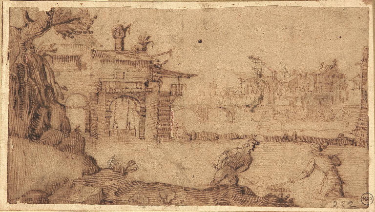 - NOTIZIE STORICO CRITICHE Una foto del disegno è conservata nell'album Lampugnani D. 15. Riccardo Lampugnani ha acquistato il foglio nel 1965, durante un'asta della galleria milanese Geri Arte, che aveva sede in corso Venezia: sul controfondo, infatti, sotto il disegno, è applicato un cartellino della galleria, con i dati dell'asta (lotto 239, vendita n° 8, 1965) prezzo totale £ 66.240). Al verso, una annotazione riferisce il disegno a Remigio Cantagallina: l'attribuzione è ripetuta anche sul passepartout. A mio avviso, però, è assai più convincente il confronto con alcuni fogli di Giulio Parigi (Firenze, fine XVI sec. - 1635), per il tratteggio condotto a tratti lunghi e precisi, densamente incrociati nelle zone d'ombra, e per le caratteristche figurette nervose e guizzanti, che molto devono alle invenzioni di Callot: si veda, in particolare, il "Paesaggio toscano" conservato presso il Gabinetto delle Stampe e dei Disegni degli Uffizi e pubblicato da Marco Chiarini nel 1973 ("Mostra di disegni italiani di paesaggio del Seicento e del Settecento", cat. n°30, pp. 30-31).