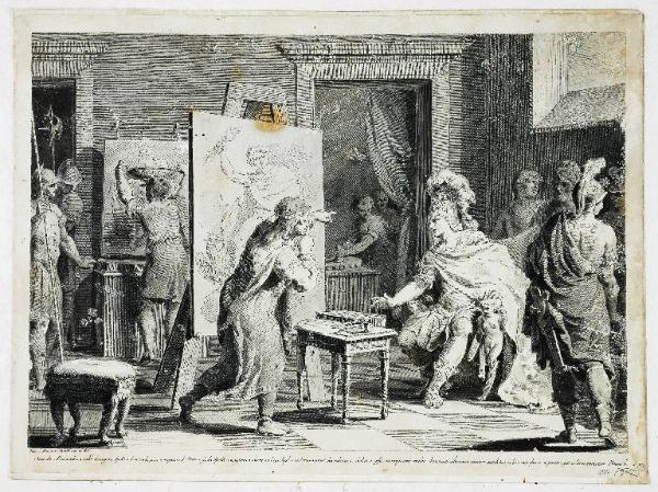 - NOTIZIE STORICO CRITICHE Una foto del disegno è conservata nell'album Lampugnani D.1(negativo Perotti n° 23439). Il foglio, per il segno minuto e preciso, che riproduce con esattezza le ombreggiature a tratteggiio dell'acquaforte, è probabilmente preparatorio per una stampa, forse un frontespizio, oppure una tavola destinata ad illustrare un libro. L'attribuzione a Pietro Antonio Novelli, attestata dall'iscrizione che corre sotto il disegno, a sinistra, è confermata dal confronto con un altro studio per la stessa composizione, appena meno rifinito e con lievi differenze nei particolari (cfr. A Bettagno "Le dessin vénitien au XVIII siècle", Venezia 1971, p. 79 cat. n° 165).