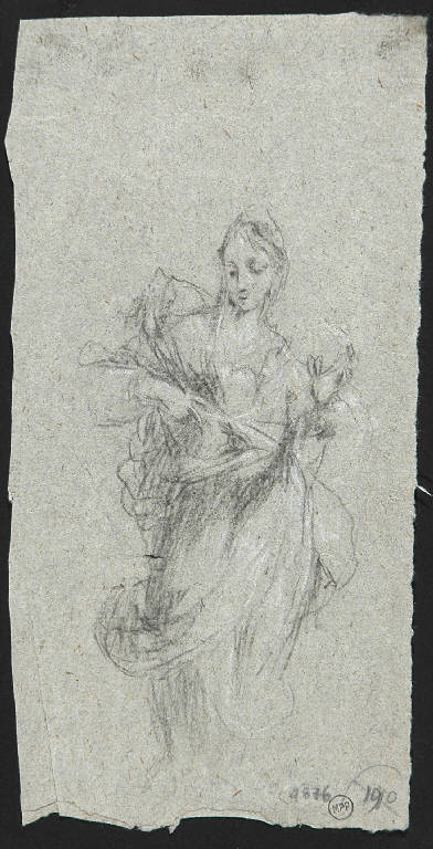 - NOTIZIE STORICO CRITICHE Questa figura femminile, delineata con pochi tratti rapidi e leggeri di matita e gessetto bianco, non reca alcuna attribuzione: a mio avviso, però, il foglio potrebbe essere assegnato a Nicola Bertuzzi (Ancona 1710 ca-Bologna 1777), pittore anconetano di nascita e protagonista poi della stagione barocchetta bolognese, accanto a Francesco Monti e Vittori Maria Bigari; il segno lieve, e la figurina esile ed allungata, dal piccolo viso aguzzo del foglio di collezione Lampugnani si ritrovano, infatti, assai simili in alcuni disegni dell'artista (si veda, ad esempio, lo studio per "Ercole assunto in Olimpo! della raccolta Franchi di Bologna, cat. n°51, pp. 110-111 in "...di bella mano. Disegni antichi della raccolta Franchi", Bologna 1998); e mi sembra suggestivo, inoltre, il confronto tra questa delicata immagine di donna e la "Santa Agnese" di Nicola Bertuzzi già in collezione Ferretti, pubblicata nel 1977 da Renato Roli (R. Roli " Pittura bolognese 1650-1800 dal Cignani ai Gandolfi", Bologna 1977, figura 261 b).