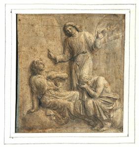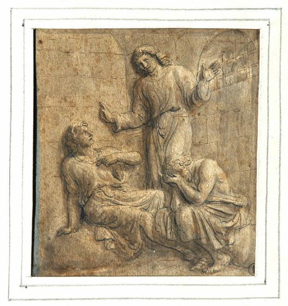- NOTIZIE STORICO CRITICHE Sul passepartout, una annnotazione, siglata A.M., riferisce il disegno a Luigi Ademollo. L'attribuzione è senz'altro da confermare: questo piccolo studio, infatti, per il tratto nitido e fermo, per la scena spoglia e severa, per il ritmo asciutto della composizione è assai vicino al foglio con un "Episodio della vita di Sant'Ambrogio" a penna, acquerello e biacca recentemente pubblicato da Adriano Cera (cfr. A. Cera "Disegni, acquerelli, tempere di artisti italiani dal 1770 ca. al 1830 ca., Bologna 2002, vol. 1, fig. 4).