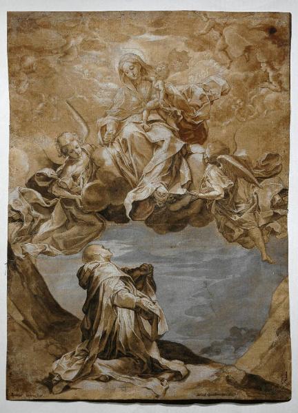 - NOTIZIE STORICO CRITICHE Riccardo Lampugnani ha acquistato questa "Madonna del Rosario" in una data certamnte anteriore al febbraio 1985: in quell'anno, infatti, il disegno fu sottoposto ad un intervento di restauro, commissionato dal collezionista alla dottoressa Nussio di Brera, come documenta un appunto posto sul verso del foglio. Alcune foto del disegno sono conservate nell'album Lampugnani D.1. Una scritta antica, posta in basso a sinistra, riferisce la "Madonna del Rosario" a Federico Barocci: e Riccardo Lampugnani ha poi precisato l'attribuzione pensando che il disegno potesse essere uno studio preparatorio per la "Madonna del Rosario" di Barocci conservata nel Palazzo Vescovile di Senigallia, e dipinta dall'artista tra il 1588 e il 1593. Il riferimento a quel dipinto è indubbiamente esatto: ma il nome di Barocci, però, a mio avviso, non può essere confermato. Il foglio di collezione Lampugnani è, con ogni probabilità, una copia antica, con lievi varianti, del cartone preparatorio per la "Madonna del Rosario" di Senigallia, ora conservato ad Oxford (cfr. cat.197, p. 167 in "Mostra di Federico Barocci", a cura di A. Emiliani e G. Gaeta Bertelà, Bologna 1975; p. 265, fig. 558 in A. Emiliani "Federico Barocci (Urbino 1535-1612). La copia è stata eseguita forse nella cerchia degli allievi di Federico Barocci, tra la fine del XVI secolo e l'inizio del XVII.