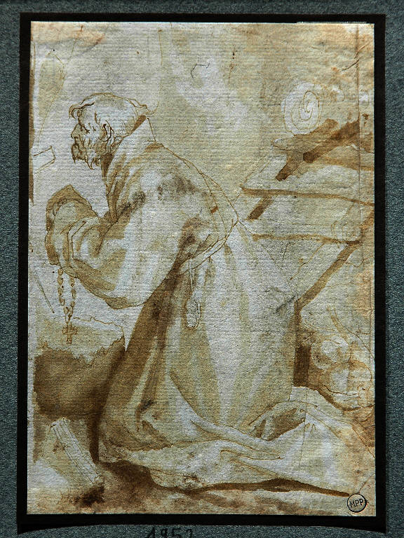 - NOTIZIE STORICO CRITICHE Il foglio reca al verso, in alto a destra, una antica attribuzione a Maganza che non è possibile, a mio avviso, confermare. L'anonimo autore del disegno di collezione Lampugnani, veneto, probabilmente, e attivo entro la prima metà del XVII secolo, mostra piuttosto, a mio avviso, qualche affinità con i modi di Claudio Ridolfi, per il segno angoloso, per le ombre liquide tracciate modulando abilmente la densità dell'acquerello (si veda, per confronto, la "Madonna con S. Francesco e altri santi" della Biblioteca Ambrosiana di Milano; p. 161 in "Claudio Ridolfi. Un pittore veneto nelle Marche del '600", a cura di C. Costanzi e M. Massa, Ancona 1994).