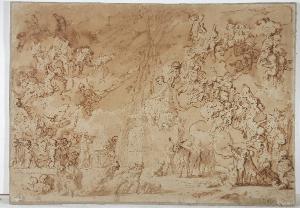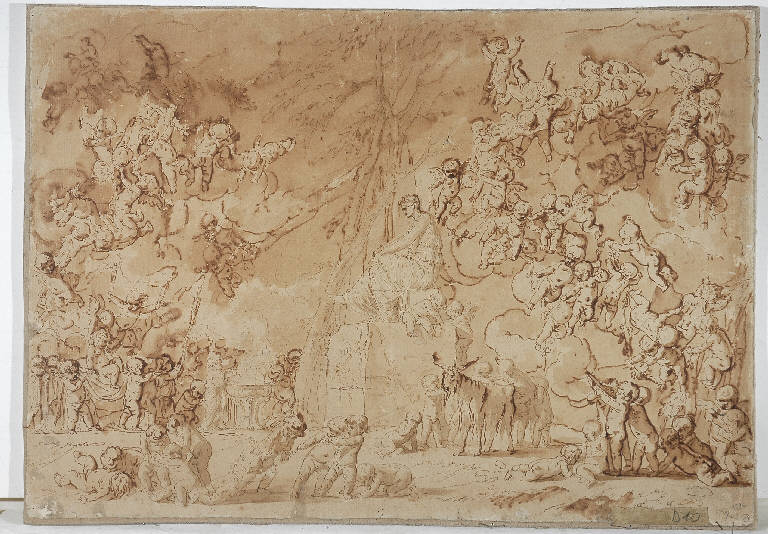 - NOTIZIE STORICO CRITICHE Una foto del disegno è conservata nell'album Lampugnani D.1: accanto, Riccardo Lampugnani ha annotato una ipotesi di attribuzione a Pietro Testa, ripetuta al verso del foglio, sul controfondo; e confortata, secondo il collezionista, dal confronto con l'immagine di un disegno di Pietro Testa passato in asta presso Christie's il 25 novembre 1971 (asta n° 140; la foto è incollata al verso del disegno, sul controfondo). Il nome di Pietro Testa può, a mio avviso, essere confermato, per questo foglio, con qualche cautela dovuta al precario stato di conservazione: il tema, un "Baccanale di putti" che si svolge all'aperto, davanti alla statua di una antica divinità, e il tratto fine e preciso, che ancora si intuisce, nonostante le cattive condizioni del disegno, si ritrovano infatti assai simili in alcuni celebri fogli dell'artista di Lucca; si veda, in particolare, lo studio preparatorio per il "Giradino di Venere" conservato presso il Gabinetto dei Disegni e delle Stampe degli Uffizi (cfr. cat.13, p. 25, fig. 13a in E. Cropper Pietro Testa 1612-1650. Prints and drawings", Philadelphia 1988); o, ancora, lo studio per un "Baccanale di putti" del Rijksprentenkabinet di Amsterdam (cfr. fig. 13c, p. 26 in Cropper cit.)