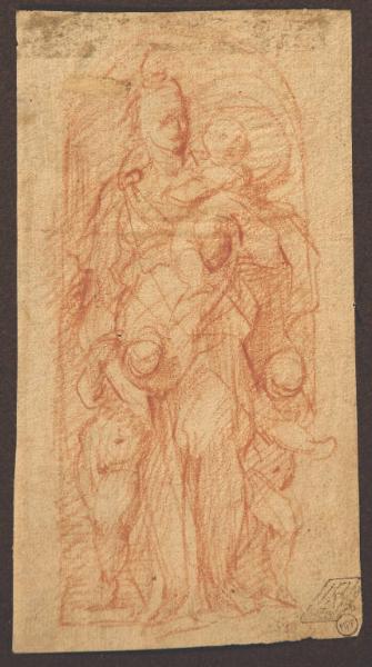 - NOTIZIE STORICO CRITICHE Il disegno, di notevole interesse, non reca alcuna attribuzione tradizionale: a mio avviso, è da assegnare ad un artista attivo a Parma attorno al terzo quarto del XVI secolo; l'anonimo autore del foglio Lampugnani rivela, infatti, qualche affinità con la cultura di Jacopo Zanguidi, detto il Bertoja (Parma 1544-1573/74), per l'eleganza di matrice parmigianinesca con cui traccia questa piccola figura di Carità (si veda, per confronto, il foglio di studi di Bertoja conservato a Princeton, cat. n° 69, pp. 233-234 in "Correggio e il suo lascito. Disegni del Cinquecento emiliano", a cura di D. De Grazia, Bologna 1984); e il movimento fluido e iinsieme nervoso della sanguigna ricorda quello, assai simile, usato da Giorgio Gandini del Grano (attivo a Parma dal 1528 al 1538) nei disegni che gli sono attribuiti: si veda, ad esempio, lo studio con "Putti che giocano" del Gabinetto dei Disegni e delle Stampe degli Uffizi di Firenze, cat. 68, pp. 123-126 in "Parmigianino e il fascino di Parma", a cura di M. Di Giampaolo e A. Muzzi, Firenze 2003. Lo studio di figure a matita posto al verso del disegno Lampugnani, sicuramente tracciato da mano diversa, sembra più tardo, e di minore qualità.