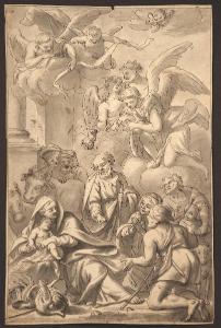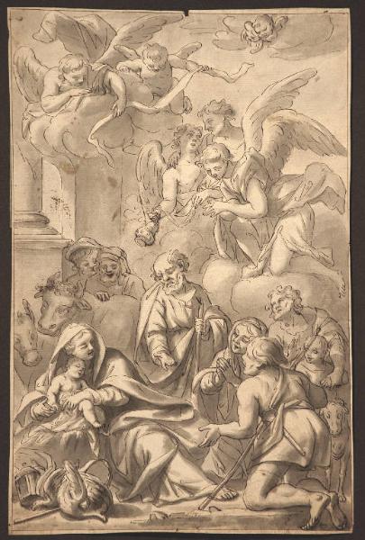 - NOTIZIE STORICO CRITICHE Una foto del disegno, al recto e al verso, è conservata nell'album Lampugnani D.5. Il foglio non reca alcuna attribuzione: a mio avviso, può essere accostato ad alcuni disegni attribuiti al napoletano Paolo de Matteis, la "Adorazione", ad esempio, a penna, inchiostro e acquerello conservata nella collezione Franchi di Bologna (cfr. cat. 75, pp. 156-157 in "...di bella mano. Disegni antichi della raccolta Franchi", Bologna, 1998), in cui compare una identica figura di angelo che regge in mano un turibolo; o il "Cristo in gloria" a matita, penna e inchiostro della collezione Ferrara Dentice, dal volto assai simile al pastore posto sulla estrema destra, in secondo piano, nella "Adorazione" Lampugnani (cfr. cat. 46, pp. 60-61, in "I disegni del cinquecento e del seicento. La collezione Ferrara Dentice", a cura di M. Causa Picone, Napoli 1999). Il verso del foglio reca alcuni studi a sanguigna e pennello rosso per un angelo, per una Madonna col Bambino, per figure maschili, da riferire con certezza alla stessa mano.