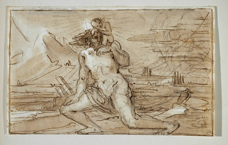 A penna, inchiostro nero, acquerello grigio-bruno e biacca su carta bianca. Riquadrato a penna.