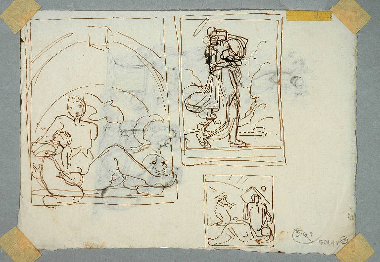 Rectoo: tre studi, riquadrati a penna, per Madonna con Bambino; a penna e inchiostro nero su carta bianca. Verso: due studi per gruppi allegorici; a penna, inchiostro nero, acquerello grigio su carta bianca.