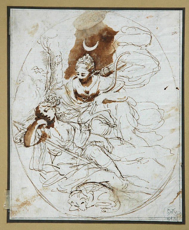 Controfondato. A matita, penna, inchiostro bruno e acquerello bruno su carta bianca. Scena figurata entro ovale a penna e inchiostro bruno; foglio riquadrato a matita.