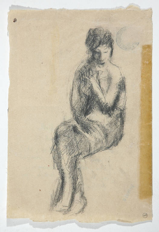 - NOTIZIE STORICO CRITICHE Una lunga nota di Riccardo Lampugnani, posta al verso del foglio, racconta la storia di questa figura femminile rapidamente tracciata da Mario Sironi sul retro di una busta che reca, in alto, un timbro postale (Milano 23/ 12/ 1959) e un'etichetta con l'indirizzo dell'artista (Milano, via Domenichino): Sironi avrebbe disegnato quella figura nel 1959, duante il periodo di convalescenza seguito ad un attacco violento della malattia che lo tormentava dal 1957; glielo aveva chiesto, per distrarlo, il dottor Riccardo Fossati, il medico che ebbe in cura il pittore negli ultimi anni della sua vita. Il disegno è stato poi donato a Riccardo Lampugnani il 15 marzo 1971 dal dottor Fossati,