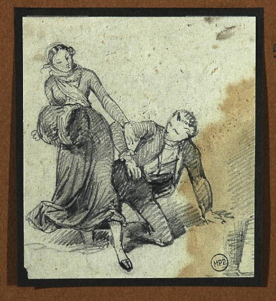 - NOTIZIE STORICO CRITICHE Sul cartoncino di supporto una nota riferisce il disegno a Francesco Gonin: l'attribuzione è senz'altro da confermare, per confronto con alcuni studi preparatori eseguiti da Gonin per le celebri vignette dell'edizione 1840-42 dei "Promessi Sposi" di Alessandro Manzoni (cfr. p. 147, fig. n° 70 in "Francesco Gonin 1808-1885", a cura di F. Dalmasso e R. Maggio Serra, Torino 1991). Come suggerisce Riccardo Lampugnani in un appunto posto sul supporto, il disegno è forse preparatorio per una illustrazione, finora non rintracciata.