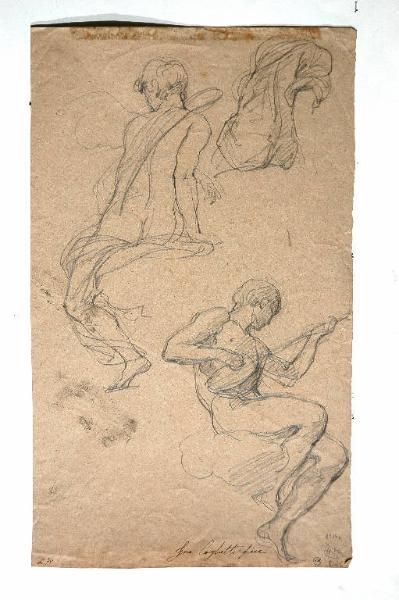 - NOTIZIE STORICO CRITICHE Il disegno reca, in basso a destra, una scritta antica: "Fr.co Coghetti fece". Il nome di Coghetti è senz'altro da confermare: e in particolare, il busto di ragazzo del verso, studiato in due diverse posizioni, è a mio avviso assai vicino alla figura del giovane coppiere, probabilmente Ganimede, che versa da bere a Giove nelle "Nozze di Amore e Psiche" dipinte da Goghetti nel 1844 per il conte Ferrante Terni di Crema (cfr. F. Mazzocca "Francesco Goghetti" in "I pittori bergamaschi dell'Ottocento", Bergamo 1992, vol. 1, p. 122). Il dipinto è una replica del perduto affresco che Coghetti aveva eseguito tra il 1834 e il 1839 in Palazzo Torlonia a Roma (Mazzocca cit., p.122).