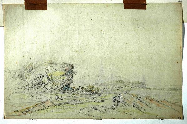 - NOTIZIE STORICO CRITICHE Il disegno non reca alcuna attribuzione, ma per confronto con il "Paesaggio" precedente (inv. 5049) è senz'altro da assegnare a Carlo Canella (Verona 1800-Milano 1879), fratello del più noto Giuseppe, pittore di paesaggi e vedute. Carlo è spesso presente alle esposizioni annuali della Accademia di Brera, negli anni tra il 1835 e il 1877, con dipinti di genere diverso: vedute, e soprattutto scene d'interno. Questo paesaggio di montagna, con un piccolo porto di lago, e l'altro, posto al verso, sembrano appunti presi rapidamente dal vero, a matita, con note veloci per memoria dei colori.