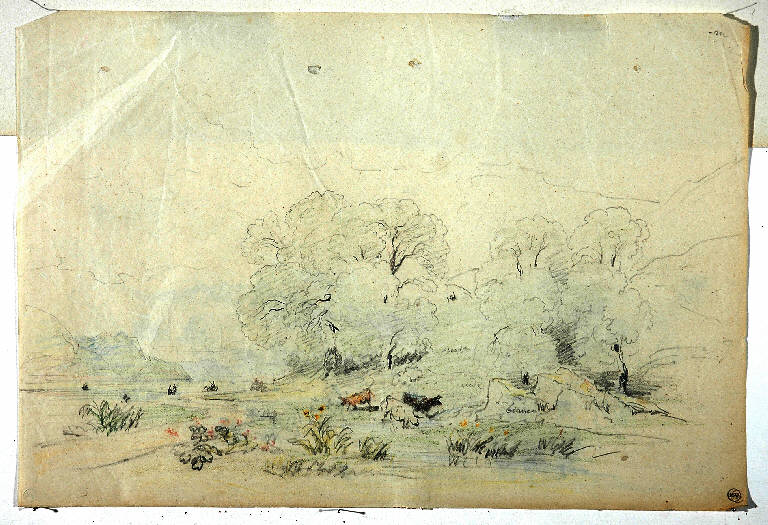 - NOTIZIE STORICO CRITICHE Il disegno non reca alcuna attribuzione, ma per confronto con il "Paesaggio" inv. 5049 è senz'altro da assegnare a Carlo Canella (Verona 1800-Milano 1879), fratello del più noto Giuseppe, pittore di paesaggi e vedute. Carlo è spesso presente alle esposizioni annuali della Accademia di Brera, negli anni tra il 1835 e il 1877, con dipinti di genere diverso: vedute, e soprattutto scene d'interno. Questo paesaggio di montagna, e l'altro, posto al verso, sembrano appunti presi rapidamente dal vero, a matita, con note veloci per memoria dei colori.