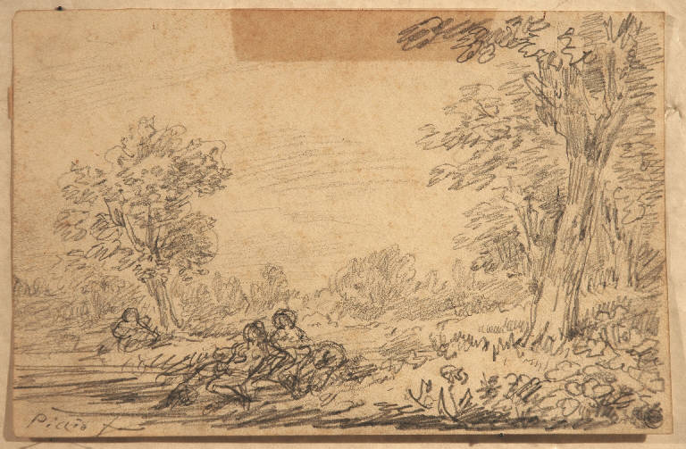 - NOTIZIE STORICO CRITICHE Riccardo Lampugnani ha acquistato il disegno nel 1968, durante un'asta organizzata dalla galleria milanese Geri: sul cartoncino di supporto, sotto il foglio, è infatti applicata una copia della ricevuta ("Gallerie d'arte Geri, corso Venezia 10, Milano, lotto n°109, vendita 8, novembre 1968, £. 132.480"). Questo bel paesaggio reca una attribuzione a Piccio, avanzata sulla base della scritta posta in basso a sinistra e senz'altro da confermare, per confronto con alcuni fogli dell'artista lombardo: si veda, in particolare, il "Paesaggio con figure" a matita, pubblicato in "Disegni di Giovanni Carnovali detto il Piccio", a cura di Piero Chiara, con un saggio di M. Valsecchi, ed. Vanni Scheiwiller, Milano 1968, p. 57.