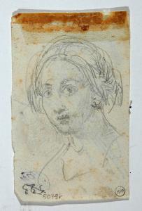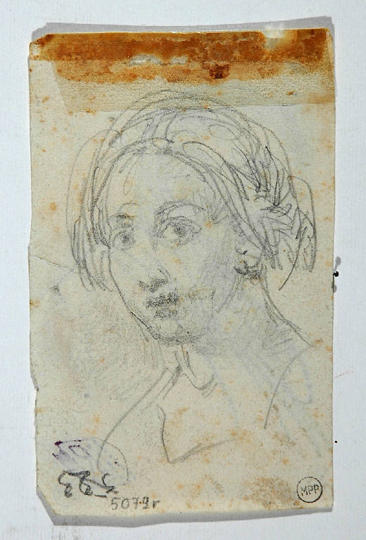 Recto: testa di giovane donna, a matita su carta bianca ingiallita. Verso: busto virile, girato di tre quarti, a matita su carta bianca ingiallita.