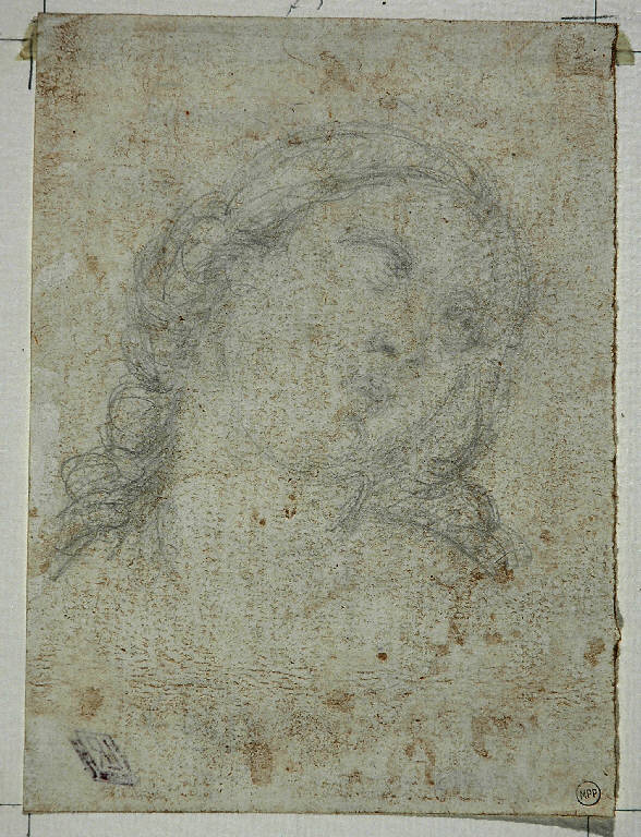 Studio di testa femminile lievemente inclinata, a matita su carta bianca ingiallita.