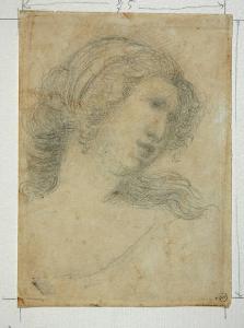 Studio di testa femminile lievemente inclinata, a matita su carta bianca ingiallita.