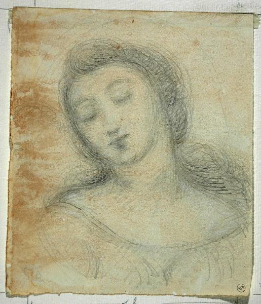 Studio di testa femminile lievemente inclinata, ad occhi chiusi, a matita su carta bianca ingiallita.