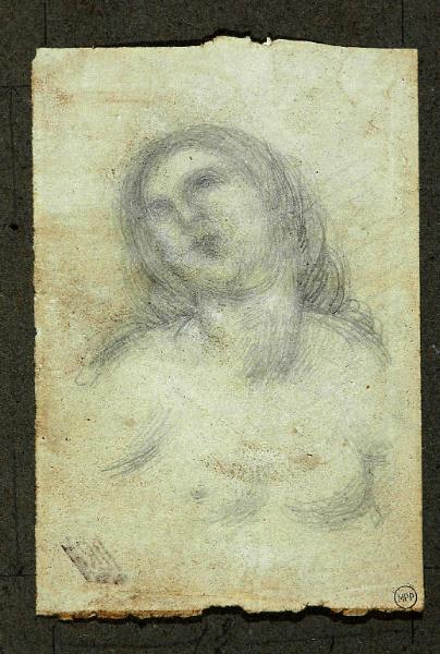 Studio di busto femminile, la testa lievemente inclinata, a seno nudo; a matita su carta bianca ingiallita.