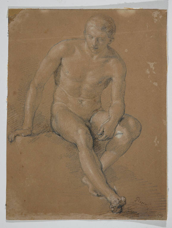 - NOTIZIE STORICO CRITICHE Sul cartoncino di supporto compare una annnotazione firmata da Caversazzi: "Questo disegno dal vivo modello a cui l'artista chiede aspetto e (...) di statua antica è opera di Giov. Carnovali detto il Piccio". Al verso, un cartellino avverte che il disegno è stato esposto alla mostra celebrativa del Piccio tenuta a Bergamo, Palazzo della Ragione, tra settembre e novembre 1974 (catalogo n° 1, p. 29 in "Il Piccio e artisti bergamaschi del suo tempo", a cura di F. Rossi e B. Lorenzelli, Bergamo 1974): il disegno è quindi entrato a far parte della collezione di Riccardo Lampugnani prima di questa data. Secondo l'autore della scheda di catalogo, lil disegno è uno studio di nudo che Giovanni Carnovali ha forse eseguito negli anni attorno al 1820, quando era allievo del Diotti.