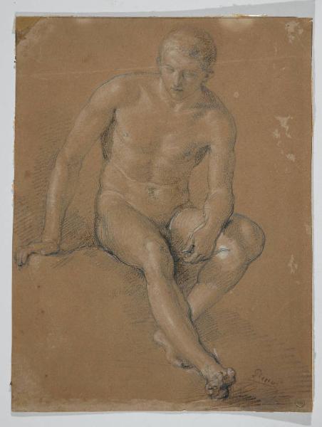Nudo di giovane uomo seduto, a matita, carboncino, gessetto bianco su cartoncino preparato nocciola.