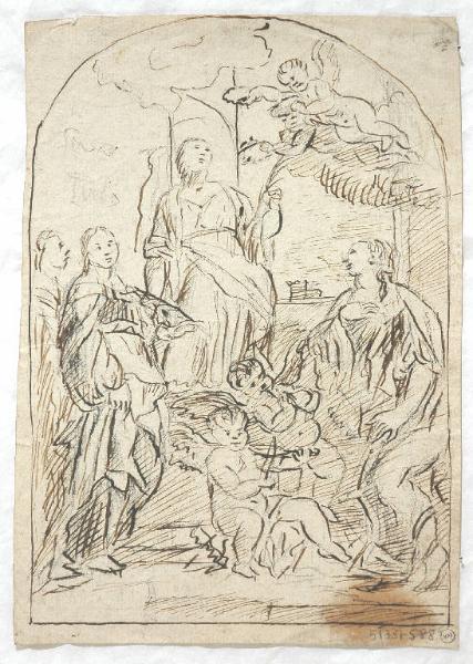 - NOTIZIE STORICO CRITICHE Questo foglio di studi per scene sacre, probabilmente preparatori per una serie di affreschi, appartiene ad un ampio gruppo di disegni che alcune scritte, poste per lo più sui cartoncini di supporto, attribuiscono genericamente ai "Morgari": il riferimento è alla nota dinastia di pittori piemontesi che lavora intensamente a Torino e nell'intero Piemonte per tutto il XIX secolo e parte del XX. Per ragioni di stile, questo foglio sembra databile alla metà dell' '800: potrebbe quindi essere assegnato a Paolo Emilio Morgari (Torino 1815 - 1882), figlio di Giuseppe, conosciuto soprattutto per la sua vasta produzione di carattere religioso. Il confronto con una cosa sicura di Paolo Emilio Morgari, il foglio inv. 5229 delle collezione Lampugnani, firmato dall'artista, conferma a mio parere questa ipotesi.