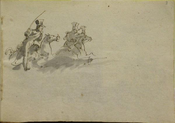 - NOTIZIE STORICO CRITICHE Non sappiamo quando questo interessante taccuino d'appunti, composto di studi di figure e d'architettura, di paesaggio e di decorazione, e di schizzi di episodi della vita di Napoleone, sia entrato a far parte della collezione di Riccardo Lampugnani; e nessuna attribuzione è mai stata proposta per cercare di individuarne l'autore. La sola informazione, una scritta a matita, compare sulla terza di copertina: "Copie da Orazio Vernet, Storia di Napoleone, su l'Ardèche". Indicazione preziosa, perchè consente almeno di precisare la data di una parte del taccuino: i disegni di tema napoleonico che l'anonimo artista ha tracciato, con mano veloce e sintetica, sull'intera seconda parte del volumetto, a partire dalla carta 7 verso, sono tratti dalle vignette che Horace Vernet aveva disegnato per la "Histoire de l'empereur Napoléon" scritta da Paul Mathieu Laurent de l'Ardèche e pubblicata a Parigi nel 1839; nello stesso anno, la tipografia torinese Fontana pubblicò la prima edizione italiana del testo, per le cure di Antonio Lissoni, che era stato ufficiale di Napoleone ("Storia di Napoleone di P.M. Laurent de l'Ardèche illustrata da Orazio Vernet voltata in italiano da Antonio Lissoni e da esso cresciuta delle imprese militari delle soldatesche italiane", Torino, Fontana, 1839). Questa edizione, senza dubbio, aveva sotto gli occhi l'anonimo autore del taccuino Lampugnani: ne copia, infatti, talvolta, brevi brani, o frasi; e annota rapidamente, con un segno a penna libero e sicuro, appena rilevato dall'acquerello grigio, i disegni di Horace Vernet che più attirano la sua attenzione. Spesso, di quelle vignette, appunta solo dei particolari: come per memoria, durante la lettura. E' possibile che quei disegni l'artista li abbia eseguiti in anni assai vicini alla data della pubblicazione del volume; e quindi attorno al 1839, o poco oltre, per l'inflessione ancora nettamente neoclassica che rivelano i primi fogli del volumetto, ricchi di piccoli studi di figure, di paesaggio, di motivi d'ornato: oltre la metà del secolo, infatti, quell'aria settecentesca sarebbe del tutto fuori tempo. Chi sia però l'autore di questi disegni, non è facile dire: anche se, a mio parere, il tratto a penna netto e pulito, l'acquerellatura veloce delle vignette di tema napoleonico sono assai vicini a quelli che usa Massimo D'Azeglio (Torino 1798 - 1866) in certi suoi libretti d'appunti degli anni '20 e '30 del XIX secolo (cfr. ad esempio le tavole n°66-67, pp. 116-117, in "Massimo D'Azeglio. Mostra organizzata dalla città di Torino nel primo centenario della morte", Torino, 1966). \nL'anonimo autore del taccuino riprende qui, in parte, la vignetta che illustra un episodio della guerra di Spagna, la battaglia di Sono-Sierra, del 29 novembre 1808 (Laurent de l'Ardèche, Torino 1839, p. 507): i "chasseurs" e i "lanciers" polacchi, agli ordini di Napoleone, caricano al galoppo le truppe spagnole e le travolgono. Il disegno di Horace Vernet raffigura, in realtà, un gruppo assai più ampio di soldati in battaglia: l'artista annota rapidamente solo due figure di "chasseurs" che vanno all'assalto, le spade sguainate.
